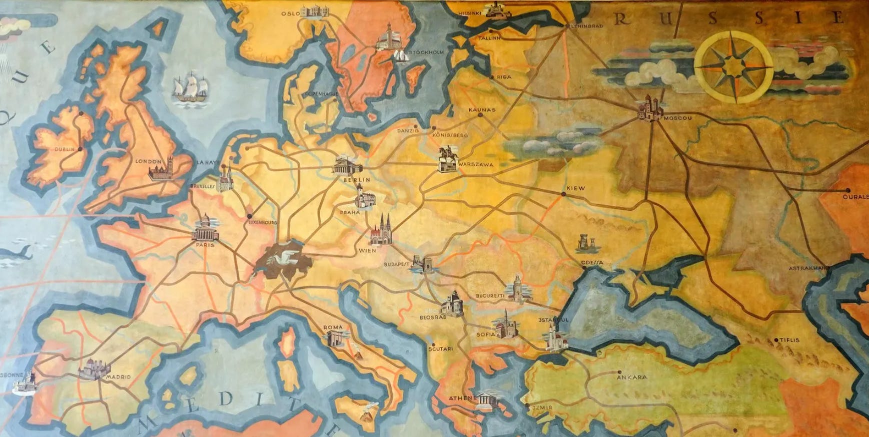 În dreptul Bucureştiului este desenat Turnul Colţei, în timp ce Atena are Parthenonul, Parisul are Pantehonul, iar la Londra se văd Parlamentul şi Big Ben-ul.